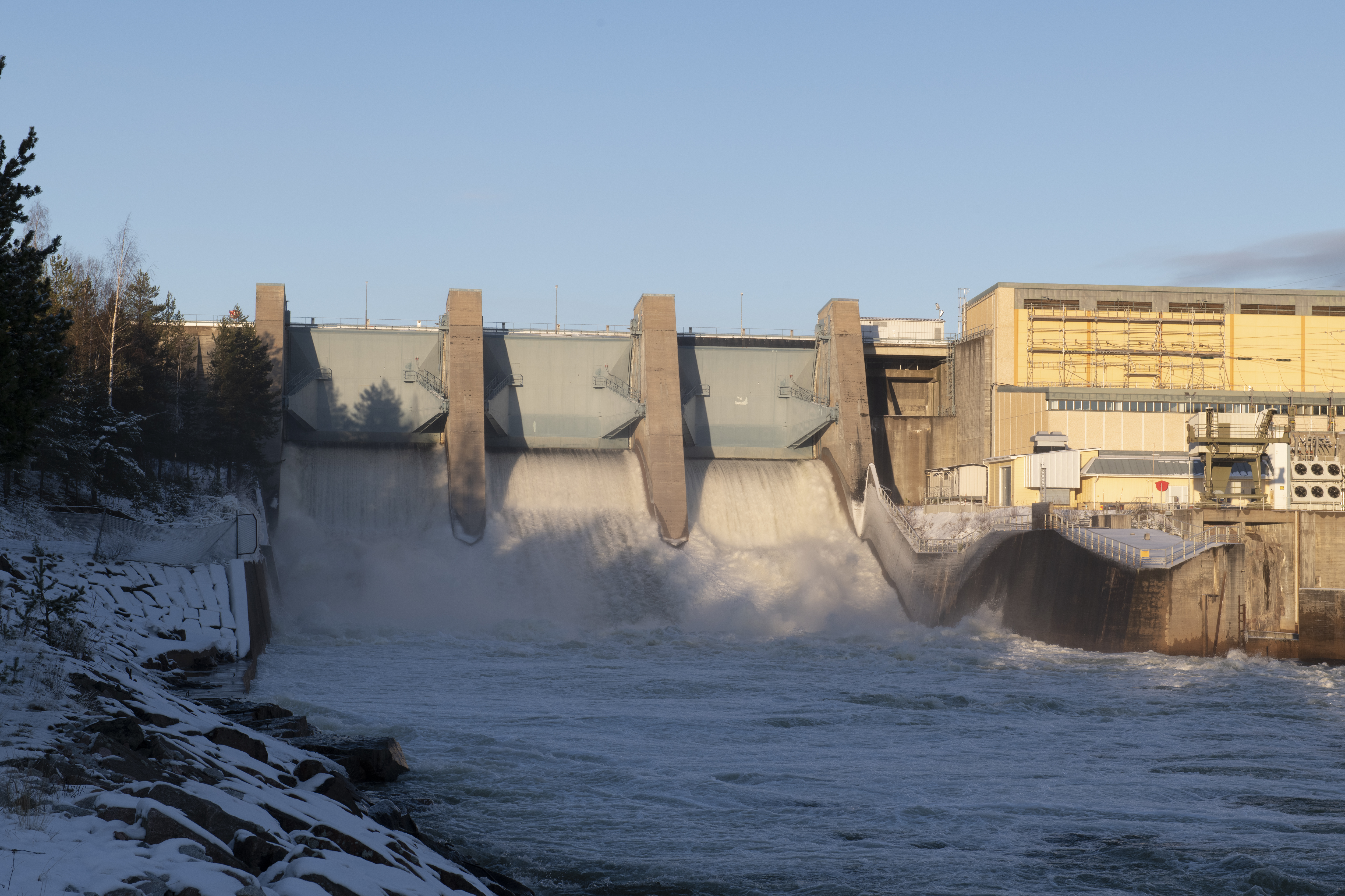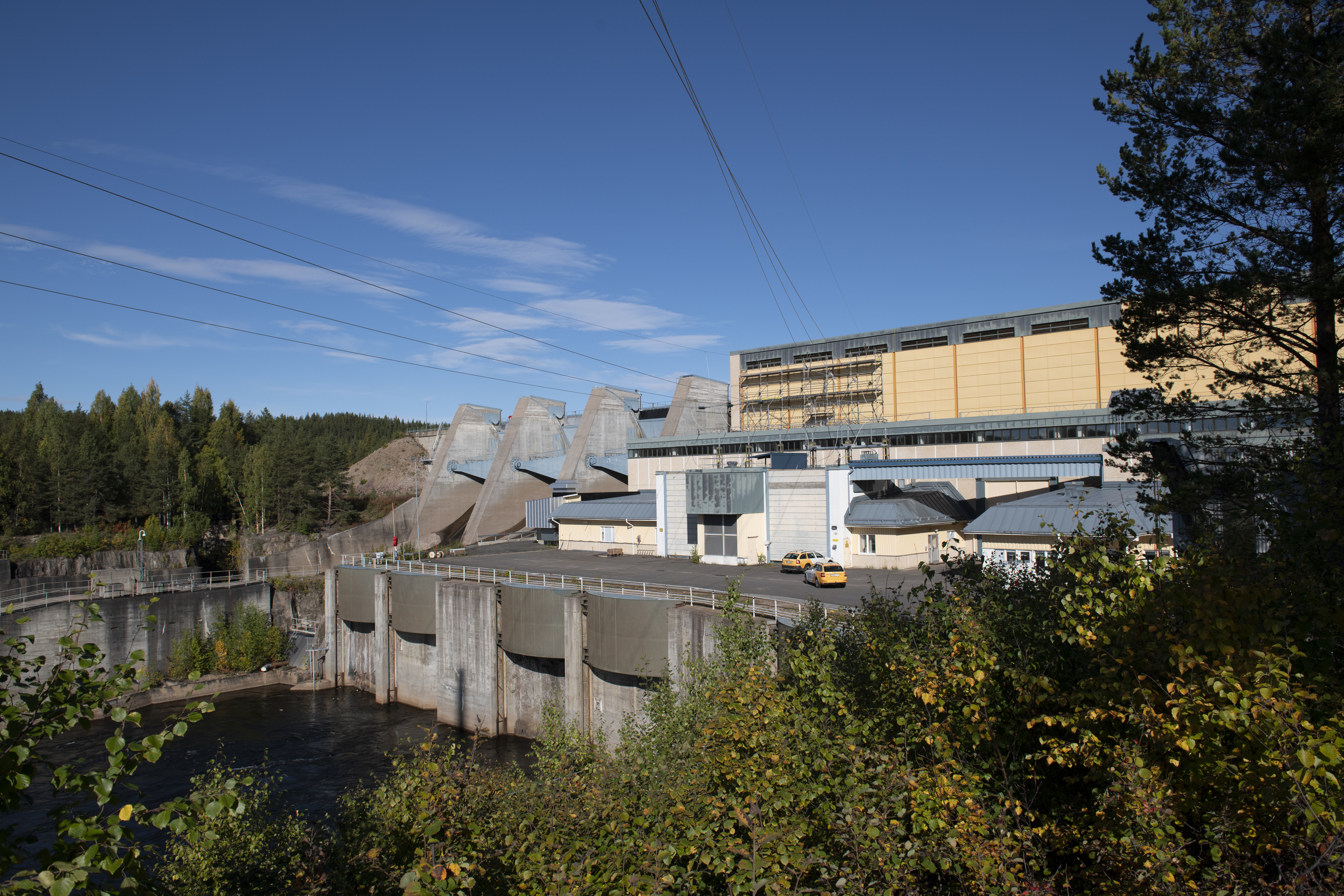 The power plant’s machine room is above ground, and was initially equipped with two power generation units with a combined power output of 116 MW, with space for a further one, which was installed in the 1980s. The turbines are of the Kaplan type, with vertical axes and concrete spirals. The dam was built downstream from the old road bridge which would later end up under water. A new bridge was built 500 metres upstream from the old one, and a 122-metre long flume that could transport 10,000 to 24,000 logs per hour was also built at the facility.